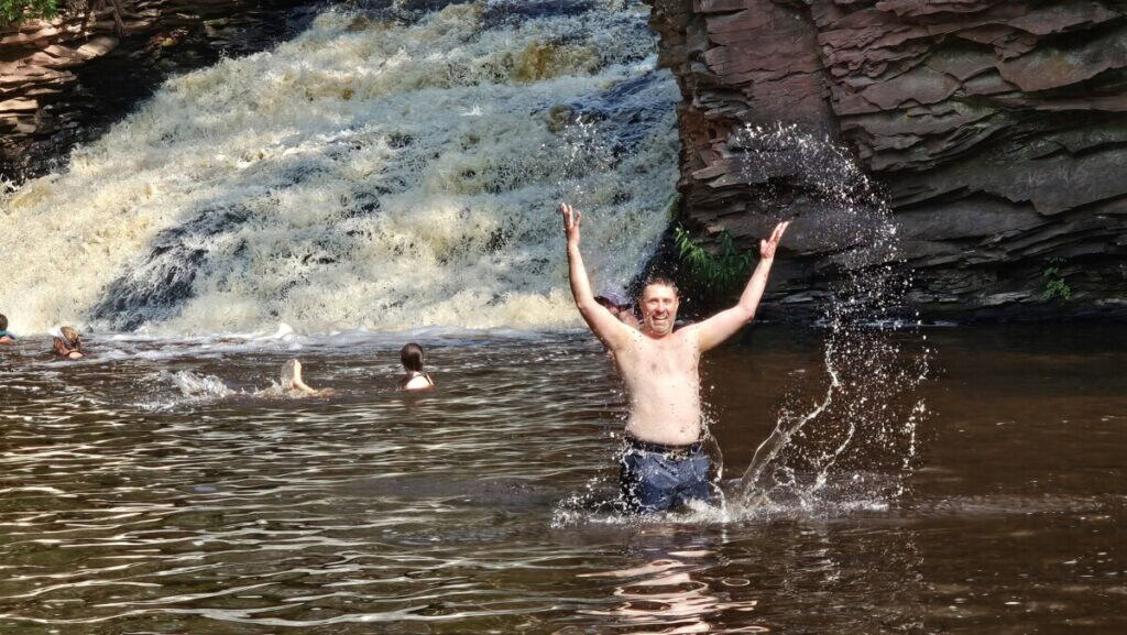 I was just at Amnicon State Park in Wisconsin. There is a waterfall there with a swimming hole at the bottom. The kids wanted to swim but I forgot my swim trunks, so I jumped in with these shorts. This is what they look like after swimming in them all day, going on a long hike, them rolling them in a ball for several days.